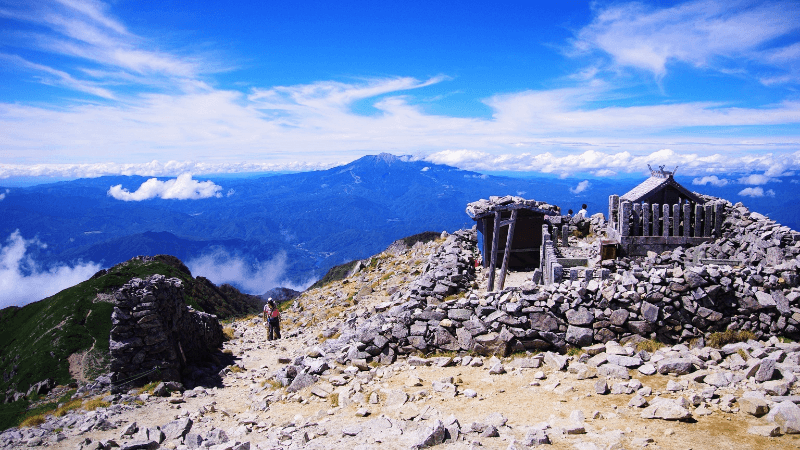 These are the ruins of Yohaijo in Mt. Ontake along the Aido-Toge. With its torii gates, shrines, and teahouses, this spot prospered as a popular resting place for people heading to Mt. Ontake during the golden age of Mt. Ontake worship. Today, the cornerstones of the torii gates and sacred monuments still remain, conveying the remnants of the past. The view of Mt. Ontake on the north side and Mt. Kisokoma on the southeast side is spectacular.