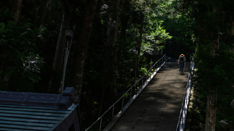Guided by the sunlight shining through the trees and lighting the path at my feet, I climb the 108 stone stairs to Ontake Satomiya Shrine.